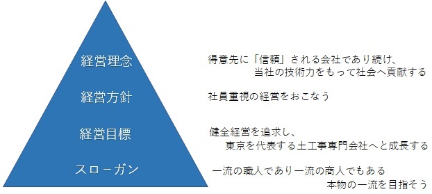 この会社方針を掲げ社員の待遇、地位向上、環境改善、経済的安定、将来に向かい安心して働くことのできる健全経営の会社を築いて行く。